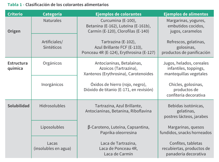 Los colorantes desempeñan una función tecnológica indispensable en la industria de alimentos procesados, no solo por su aporte estético, sino también por su influencia psicológica en la percepción de sabor, frescura y calidad[2,3]. Su clasificación res ponde a criterios de origen, estructura química y comportamiento físico. Según el origen, se dividen en naturales y artificiales; desde el punto de vista químico, pueden ser orgánicos o inorgánicos; mientras que en función de su solubilidad, se agrupan en liposolubles, hidrosolubles o insolubles, siendo estos últimos conocidos como lacas[4]. Según su clasificación se establecen diferencias clave en cuanto a estabilidad, intensidad cromática y compatibilidad con matrices alimentarias específicas(1). Por ejemplo, los colorantes liposolubles como los carotenoides se emplean en matrices ricas en lípidos como margarinas, snacks extruidos y confitería grasa. Por su parte, los hidrosolubles se prefieren en bebidas, gelatinas y productos lácteos. Las lacas, que son pigmentos insolubles adsorbidos sobre un sustrato inerte como el aluminio hidratado, se utilizan cuando se desea una coloración uniforme y estable en productos secos o recubiertos, como galletas, tabletas o confites.