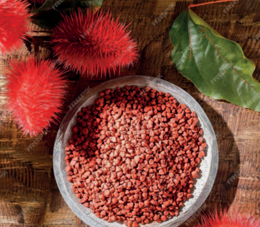 Annatto. Pigmento carotenoide derivado de las semillas de Bixa orellana, contiene bixina (lipofílica) y norbixina (hidrosoluble), ampliamente empleadas en quesos, productos cárnicos y grasas alimentarias[55, 56]. Su extracción se realiza mediante disolventes orgánicos, microondas o tecnologías super críticas[57]. Con buena estabilidad térmica hasta los 180°C y efectos antioxidantes comprobados, el annatto se ha consolidado como una opción preferida en formulaciones sin aditivos sintéticos[58-60].