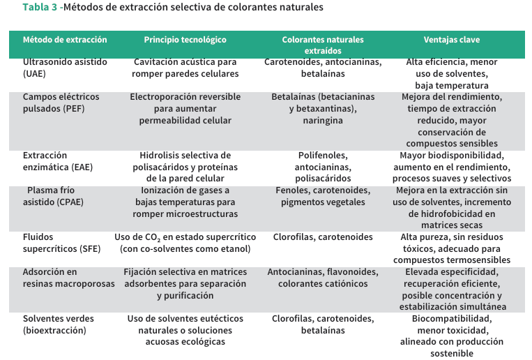El desempeño funcional de los colorantes también depende de su interacción con ingredientes específicos de cada formulación[27, 47]. Ante ello, se han desarrollado métodos de extracción selectiva (2), tecnologías de estabilización adaptadas y formulaciones que mejoran la compatibilidad del colorante con distintas matrices[66]. La industria alimentaria ha comenzado a implementar estas soluciones para responder a la demanda por productos naturales, sostenibles y saludables[13, 23].