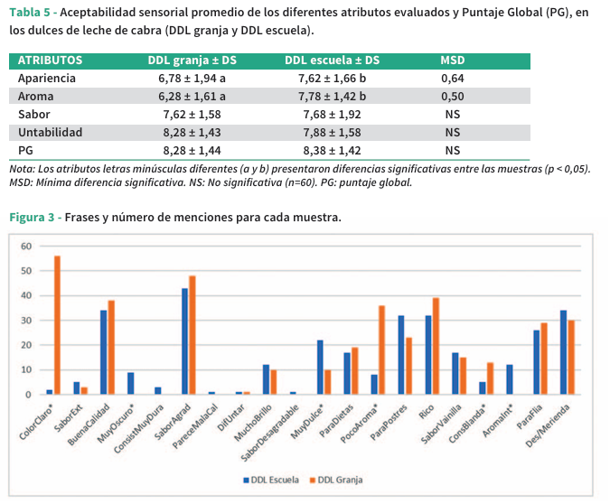 Las dos muestras de DDL evaluadas presentaron aceptabilidad media-alta en los atributos evaluados y en el Puntaje Global (PG), con valores mayores a 6 (Tabla 5). En el ANOVA se observó que la apariencia y el aroma presentaron diferencias significativas (p<0,05), siendo mayor la aceptabilidad del DDL elaborado por la escuela. El puntaje global no presentó diferencias entre las muestras (p>0,05) (Tabla 5).