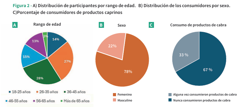 Perfil de los consumidores. En la Figura 2 se presentan las distribuciones de perfiles de los consumidores que participaron del ensayo clasificados por rango de edad (A), sexo (B) y frecuencia de consumo de productos caprinos (C). Los porcentajes se obtuvieron en base al total de 60 consumidores que participaron del ensayo. Casi el 80% de los participantes fueron mujeres y más de la mitad no habían consumido productos lácteos caprinos ninguna vez.