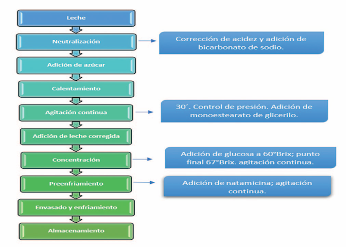 F) El punto final del proceso de concentración de la leche se determina mediante refractometría, midiendo los °Brix. Cuando la mezcla llega a los 60°Brix se incorpora glucosa y se mezcla con agitación continua.