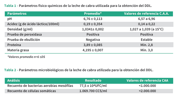 El DDL se elaboró con leche caprina provista por el establecimiento Granja La Piedra, obtenida a partir del rodeo de cabras de la raza Saanen. Dicho establecimiento contaba con la habilitación para tal fin. La leche de analizó de acuerdo a los requerimientos del CAA. Condiciones higiénico-sanitarias: se realizó Recuento de Células Somáticas: método FIL 148A:1995 y de Recuento Aerobios Mesófilos (RAM): método FIL 100B:1994) y según sus parámetros físico-químicos y composicionales. Se evaluó la acidez empleando NaOH 0,1 N en presencia de una solución alcohólica de fenolftaleína (AFNOR, 1980). La acidez se expresó como porcentaje de ácido láctico (1 mL de NaOH 0,1 N=0,009 g de ácido láctico). El porcentaje de acidez se calculó mediante la siguiente ecuación: %Acidez= (ml de NaOH) x (N de NaOH) x9/(Peso de la muestra) x100. Medición del pH: con pHchímetro digital calibrado con soluciones Buffer de pH 4 y 7. Determinación de proteína bruta: método Micro-Kjeldahl (Norma 20B, Fil-IDF 1993). El contenido de proteína de la muestra se calculó con el factor 6,38. Determinación de grasa bruta: método Rose Gottlieb (AOAC 905.02). La leche utilizada para su transformación en DDL se mantuvo almacenada en un tanque refrigerado a 5 °C, con agitación constante, hasta el momento de su utilización.
