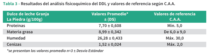 La composición del DDL se presenta en la Tabla 3 junto a valores de referencia establecidos en el C.A.A. para un DDL tradicional, elaborado con leche vacuna. El DDL elaborado con leche de cabra no tiene valores de referencia en el C.A.A. Sin embargo, los parámetros fueron acordes a los requisitos establecidos para el DDL de leche de vaca.