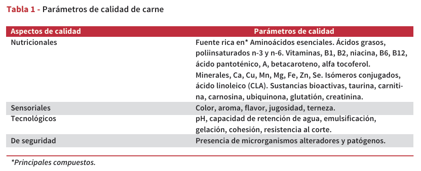 La calidad de la carne se puede determinar mediante cuatro parámetros relevantes: nutricional, sensorial, tecnológico y de seguridad (Tabla 1). Todos estos parámetros están interrelacionados y afectan la calidad y la vida útil (VU) de la carne. La falta de cumplimiento de cualquiera de estos parámetros conlleva la pérdida de producto y la insatisfacción del consumidor. Por lo tanto, es crucial comprender su influencia en la vida útil de la carne. Por otro lado, las elecciones de los consumidores de alimentos dependen tanto de las características objetivas del producto como de sus percepciones acerca de ellas. Este proceso de decisión, a su vez, se ve afectado por el flujo de información que reciben y la forma en que son capaces de procesarla. Las demandas individuales de los productos, y en particular los diferenciados, dependen del precio, de los atributos de calidad, de la disponibilidad y de las tendencias de consumo. La calidad de los productos incide tanto sobre las decisiones que toman los consumidores a la hora de adquirir un alimento, como sobre las empresas en sus funciones de producción y costos de los alimentos que producen. La calidad, entonces, es un aspecto crítico en la producción, procesamiento y comercialización de los alimentos. Para el caso de la carne vacuna en nuestro país, hay dos mercados bien diferentes: el doméstico y el exportador. Hay una tendencia incipiente pero creciente de comercialización de carne envasada en el mercado doméstico. Tanto para este sector como para el exportador –especialmente- los aspectos de estabilidad y vida útil de la matriz cárnica son relevantes para la sostenibilidad y crecimiento del negocio. La vida útil alcanzada es un efecto aditivo de todas las etapas de la cadena de valor, comenzando con el manejo del animal en pie, las operaciones de perifaena y faena, el primer procesamiento, el envasado del producto y la adecuada gestión de la cadena de frío.