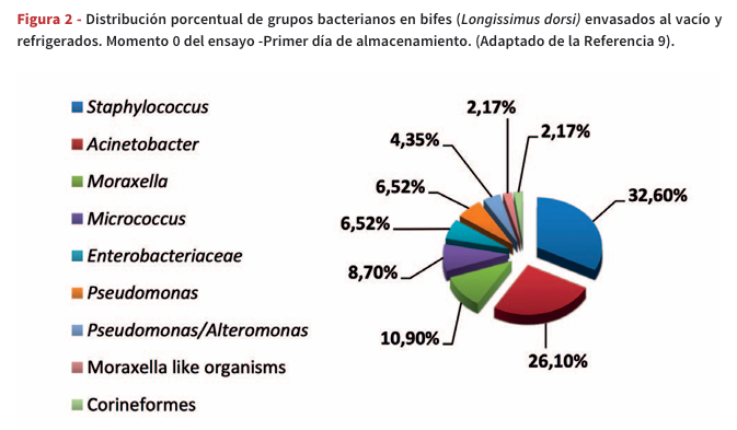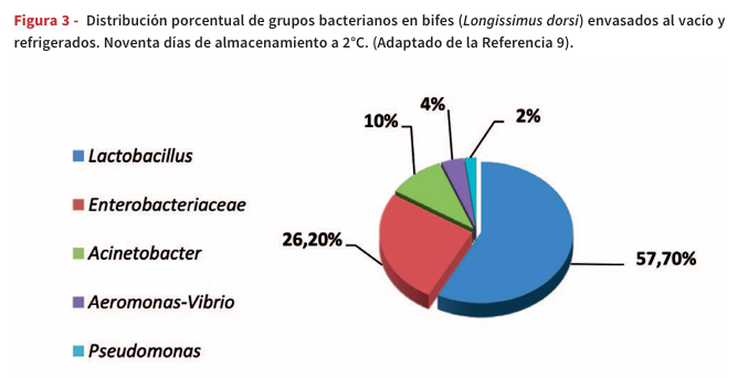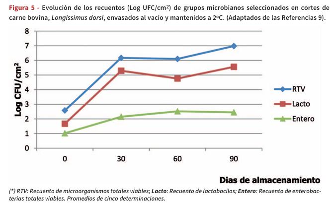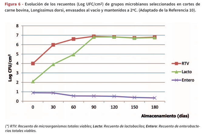 El medioambiente del envasado usado en los cortes de carne tiene un efecto específico sobre la ecología de los microorganismos capaces de desarrollarse en el producto en el curso de su vida útil. En este contexto, el envasado al vacío y las temperaturas de refrigeración son usados para retardar el desarrollo microbiano, para minimizar cambios bioquímicos no deseados y, por lo tanto, extender la vida útil de los cortes de carne. El objetivo microbiológico principal del EV, sin embargo, es la inhibición parcial y eventualmente total, de la biota alteradora que desarrolla rápidamente: las bacterias Gram negativas, aerobias y anaerobias facultativas. Idealmente el EV permite el predominio beneficioso de la biota acido-láctica, que tiene un muy bajo potencial como alterador. Este sistema de envasado ha sido diseñado particularmente para proveer una vida útil extendida, adecuada para la exportación a ultramar (Tabla 3, Figuras 5 y 6).