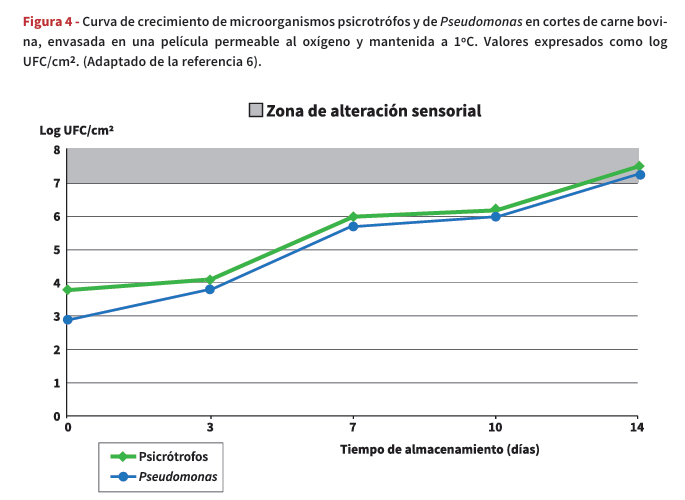 Particularmente, en las condiciones ensayadas en la Figura 4 (corte de carne vacuna bajo condiciones reales de la industria, polietileno como película de envasado y temperatura de almacenamiento de 1°C), se demostraron signos de alteración a partir de los 11 días; sin embargo, cuando las muestras fueron expuestas a un período de abuso de temperatura de 24h a 9°C mostraron un aumento de aproximadamente 1log en los recuentos microbianos considerados (psicotrofos y Pseudomonas), y en estos casos los signos de alteración aparecieron antes. Este efecto de deterioro en particular está causado fundamentalmente por la acumulación de un gran número de células microbianas y en menor medida por la actividad metabólica de la microbiota presente. Del mismo modo, pueden ocurrir cambios de color debido crecimiento de los microorganismos en la superficie de la matriz respectiva, como por ejemplo el enverdecimiento de las carnes, causadas por BAL.