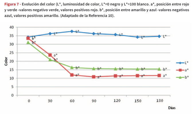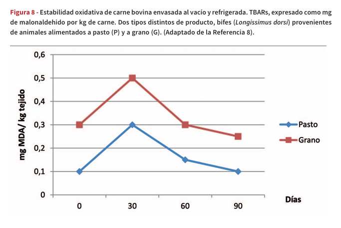 Uno de los criterios primarios de compra de carne fresca es el color. En las carnes rojas, el consumidor relaciona el color rojo brillante con la frescura, discriminando la carne que se ha tornado amarronada en color. El color rojo intenso y brillante se desarrolla con la interacción de la mioglobina, presente en la carne, con el oxígeno presente en el aire. En el caso del EV, al madurar la carne el pigmento mioglobina se transforma dando un color parduzco, el cual sin embargo cambia rápidamente a oximioglobina al abrir el paquete y vuelve a su estado de mioglobina de color rojo brillante al captar el O2 del aire (Figura 7). Las condiciones que hacen muy deseable la carne para algunos y no aceptable para otros (en términos de la vida útil), están constituidas por numerosos factores, incluyendo la dieta y el medio ambiente animal perifaena, el manejo postfaena y las preferencias de los consumidores. La oxidación lipídica es una típica reacción en cadena que ocurre con los radicales libres que se generan a partir de las grasas poliinsaturadas presentes en el tejido muscular y responsable de off flavor en la carne cocinada. La ausencia de O2 en el EV favorece la no aparición de oxidación lipídica, es decir que favorece la estabilidad del producto. Trabajos realizados en nuestro país demuestran una buena estabilidad lipídica en cortes EV y mantenidos por largos periodos de almacenamiento, medidos por valores de TBA. Del mismo modo el agregado de vitamina E en la dieta de los animales ha logrado mejorar también la estabilidad lipídica, como ha sido demostrado por trabajos realizados en nuestro país (Figura 8).
