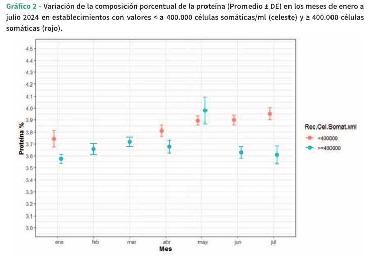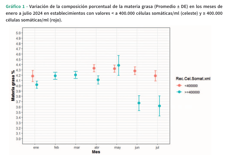 Análisis estadístico. Para todos los análisis estadísticos se empleó el software R (Equipo Central de R, 2023). Los datos recopilados se analizaron mediante estadística descriptiva. Las variables cuantitativas se resumieron a través del promedio y el error estándar, y las variables cualitativas se describieron mediante frecuencias absolutas y relativas. Para cada una de las variables cuantitativas de interés (porcentaje de materia grasa, proteína, lactosa y sólidos totales), se ajustó un modelo lineal general mixto. En estos modelos, cada una de las variables mencionadas se tomaron como variables respuesta, y como efectos fijos se tomaron el grupo (definido como mayor e igual o menor a 400.000 cél/ml) y el mes. Al mismo tiempo, se incorporó el establecimiento como un efecto aleatorio en el modelo, considerando así la correlación existente entre las observaciones realizadas en el mismo lugar a lo largo del tiempo. En todos los análisis realizados se estableció un nivel de significancia de 0,05.