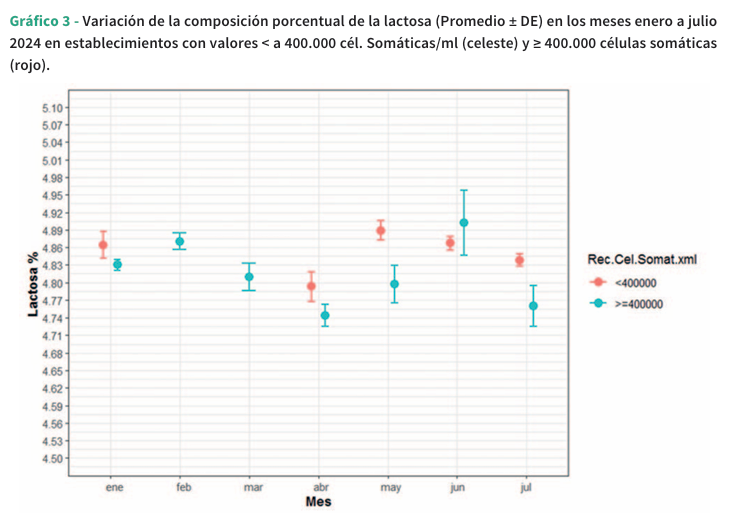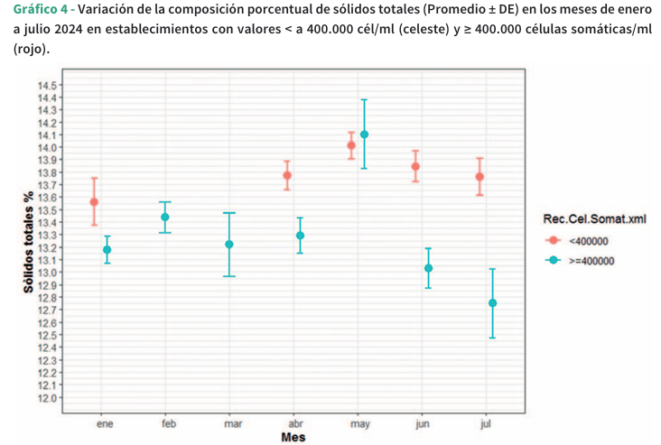 La materia grasa de la leche es el componente más variable y puede afectarse por raza, alimentación, etapa de la lactancia, edad, presencia de mastitis y efectos ambientales (Ramírez-Rivera y col., 2019). La proteína bovina está representada por la caseína entre el 78-80%. El 20% restante corresponde a las proteínas solubles del suero como la lactoalbúmina, la lactoglobulina y otras sustancias nitrogenadas no proteicas como la urea (Pereira, 2014). La lactosa es el azúcar de la leche y es responsable del gradiente osmótico, lo que determina el volumen de leche a producir. Este hecho puede estar asociado con la eficacia del nivel de lactosa como predictor de la calidad de la leche en vacas, ovejas y cabras (Leitner y col., 2011) y es un ingrediente importante para las industrias alimentaria y farmacéutica (Costa y col., 2019). En productos alimenticios donde el agua es el componente dominante (83-84%), se valoran los niveles de sólidos totales (ST) que corresponden a la suma de grasa, proteína total y verdadera, lactosa y minerales (Contero y col., 2021). En los establecimientos con recuentos de células somáticas <400.000 cél/ml, el contenido de materia grasa, proteína, lactosa y sólidos totales fue superior en todos los meses evaluados, con la excepción de mayo. En la Tabla 1 se muestran los valores promedio obtenidos en ambos grupos de estudio. Las mayores diferencias se observaron en los meses de junio y julio, donde el promedio de materia grasa y proteína fue significativamente mayor en las muestras con menor recuento celular. A partir de mayo, se notó una mayor variabilidad en las muestras con un recuento de células somáticas ≥400.000 células/ml.