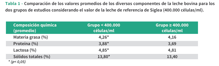 En el presente trabajo se concluye que recuentos de células somáticas mayores a 400.000 cél/ml se relacionan con una menor calidad composicional de la leche cruda, lo que afectaría el rendimiento y la calidad final de los productos lácteos. La incorporación de los sistemas de pago por calidad que se basan en la leche de referencia de SIGLeA, permiten establecer estándares de calidad. Sin embargo, es necesario un enfoque innovador a nivel nacional, que contemple en los programas del control de mastitis no sólo a los tambos, sino también a los proveedores de servicios e insumos y al sector industrial.