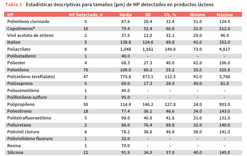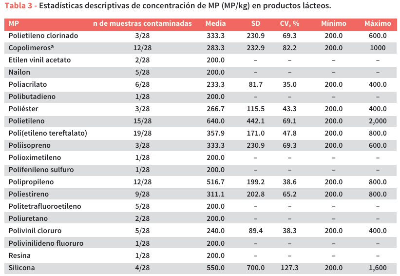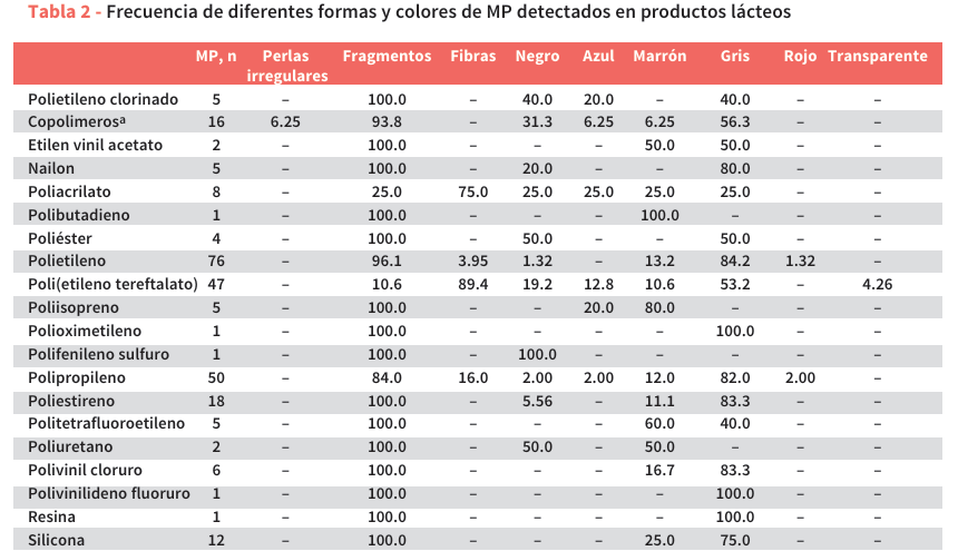 Por el contrario, Kutralam-Muniasamy41 y Basaran43 encontraron concentraciones de MP considerablemente más bajas en leche líquida comercial de diferentes marcas, que oscilaron entre 1 y 16 MP/L y entre 3 y 11 MP/L, respectivamente. La gran variabilidad en los niveles de MP detectados en los diferentes estudios puede atribuirse a las diferencias en las características de las muestras -como el tipo de pro ducto lácteo, el contenido de grasa y el origen-, así como a la etapa específica del proceso de producción láctea muestreado, junto con los protocolos de medición de MP empleados. Las fuentes comunes de MP incluyen envases de plástico, materiales en contacto con alimentos utilizados durante el procesamiento y fibras sintéticas de la ropa de los operarios30,31.