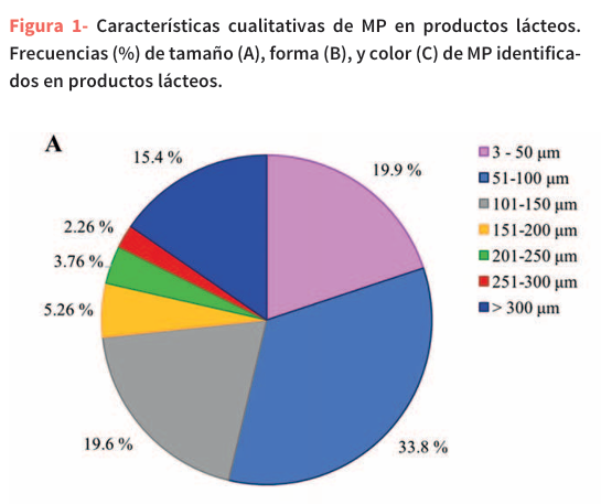 Se puede concluir que la contaminación por MP varía considerablemente entre los diferentes productos lácteos. Las 28 muestras analizadas, incluyendo leche líquida, queso fresco y queso curado, mostraron una amplia variabilidad de MP en cuanto a tamaño, forma y color. El tamaño de MP detectado osciló entre 24,0 y 4817 µm, con un promedio de 243,7 µm. Los fragmentos irregulares fueron la morfología predominante (77,4%), y la gran mayoría de los MP estaban pigmentados, siendo el gris (68,4%), el marrón (15,0%) y el negro (9,77%) los colores más frecuentes. Los polímeros detectados con mayor frecuencia fueron el poli(tereftalato de etileno), el polietileno y el polipropileno, presentes en 19, 15 y 12 muestras, respectivamente. Se observaron diferencias significativas en las concentraciones de MP en los distintos productos lácteos, siendo el queso curado el que presentó los niveles más altos de MP (1857 MP/kg), seguido del queso fresco (1280 MP/kg) y la leche (350,0 MP/kg). Estos hallazgos enfatizan la importancia de considerar el tipo específico de producto lácteo al evaluar el grado de contaminación por MP en el sector lácteo. Tanto el proceso de producción como los materiales de envasado utilizados pueden influir en el nivel de contaminación, por lo que se deben desarrollar estrategias de mitigación específicas en consecuencia. Se recomienda realizar investigaciones futuras a nivel de planta, abarcando todas las etapas del proceso de producción, para identificar fuentes específicas de contaminación por MP y respaldar el desarrollo de estrategias de mitigación eficaces.