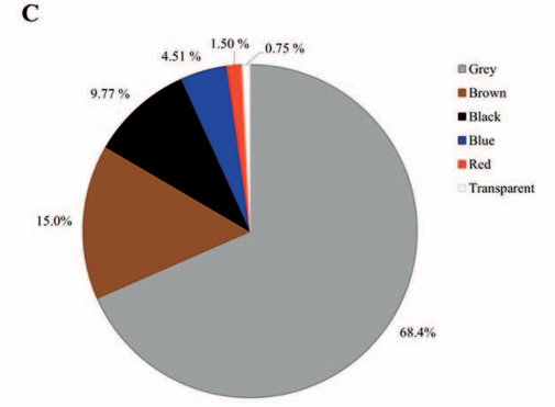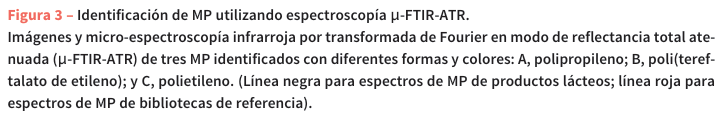 Las frecuencias del color de MP detectados en los productos lácteos también se muestran en la Tabla 2. El MP gris se observó predominantemente en polietileno (84,2%), poliestireno (83,3%), cloruro de polivinilo (83,3%) y polipropileno (82,0%). Se detectaron MP marrones y negros en proporciones menores, encontrándose en 13 y 11 de los 20 polímeros identificados, respectivamente. El MP transparente se encontró exclusivamente en el poli(tereftalato de etileno) (4,26%), lo cual puede atribuirse a componentes específicos del envase. Como se muestra en la Figura 1C, aproximadamente el 93% de los MP identificados en este estudio estaban pigmentados, siendo el gris (68,4%), el marrón (15,0%) y el negro (9,77%) los colores más prevalentes. Sin embargo, Buyukunal47 informó una distribución de colores diferente, siendo los más abundantes el azul (19,8%), el rojo (17,9%) y el transparente (15,0%), seguidos del negro (11,2%). Además, es importante considerar que se pueden añadir diversos pigmentos de color a las mezclas de polímeros durante el proceso de producción. Por lo tanto, los colores observados al microscopio pueden deberse a los pigmentos y aditivos utilizados en la fabricación de envases de plástico46. Por esta razón, la confirmación mediante microespectroscopía infrarroja por transformada de Fourier es esencial para una identificación concluyente. El predominio de MP gris observado en nuestro estudio respalda la hipótesis de que las principales fuentes de contaminación en los productos lácteos están relacionadas con los plásticos y materiales de envasado en contacto con alimentos. El MP gris se asocia comúnmente con componentes plásticos industriales utilizados en el envasado de alimentos, como películas, revestimientos y cierres, que a menudo contienen pigmentos neutros30. Su presencia puede deberse a la abrasión mecánica, el envejecimiento o la degradación de estos materiales durante el procesamiento, la manipulación o el almacenamiento, más que a la contaminación ambiental35,41.