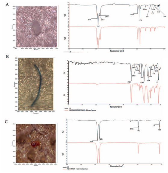 Las membranas filtrantes se analizaron con un espectrómetro FTIR Frontier acoplado a un microscopio Spotlight 400 (PerkinElmer Italia Spa, Milán, Italia). Los polímeros se identificaron mediante microespectroscopia infrarroja por transformada de Fourier, con longitudes de onda de detección espectral en el rango de 4000 cm−1 a 650 cm−1. Cada partícula de MP detectada se sometió a cuatro barridos repetidos de µ-FTIR-ATR, hasta obtener el espectro promedio final. Los espectros de fondo se registraron utilizando aire como medio de referencia. Para minimizar errores, los espectros obtenidos para cada partícula de MP se corrigieron restando los espectros de fondo de aire correspondientes. De esta manera, los espectros se compararon con una biblioteca de referencia utilizando Software Spectrum 10 (PerkinElmer Italia Spa, Milán, Italia) (Figura 3).