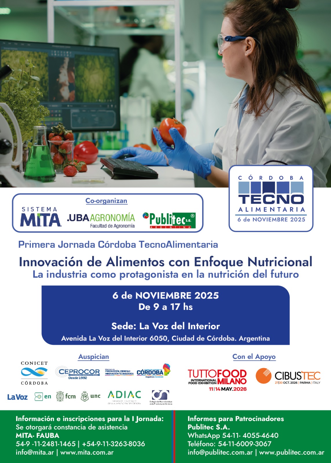 El día jueves 6 de noviembre de 9 a 17 hs se llevará a cabo la 1° Jornada Córdoba Tecnoalimentaria organizada por Sistema MITA, UBA Agronomía y Publitec. La misma tendrá lugar en La Voz del Interior, ubicada en Avenida La Voz del Interior 6050, Ciudad de Córdoba, Argentina. CLICK ACÁ PARA PODER INSCRIBIRTE A LA JORNADA.