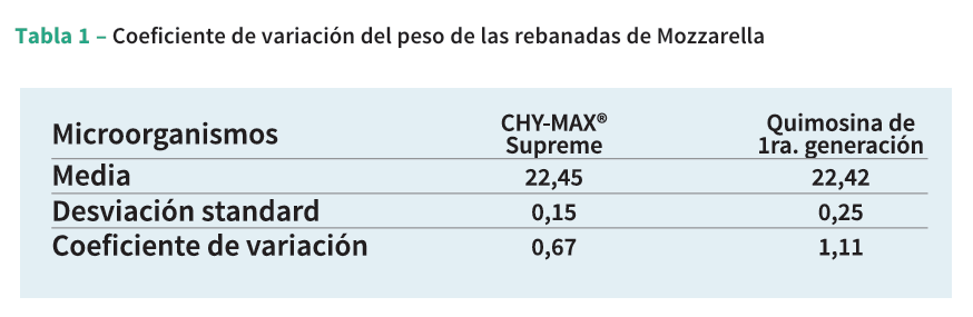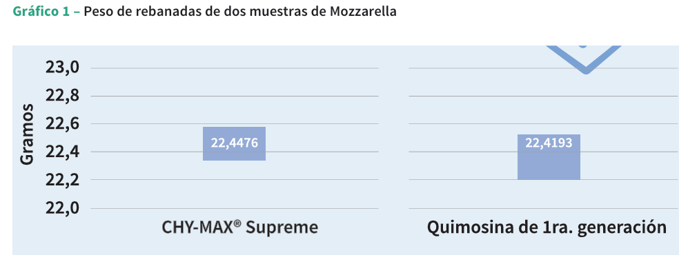 Para minimizar la proteólisis excesiva y mantener la firmeza adecuada del queso, se recomienda usar coagulantes con una alta relación C/P, lo que facilita un corte preciso y reduce el riesgo de variaciones en el peso de las rebanadas. En el gráfico 1 y la tabla 1 se observa que la muestra preparada con el coagulante CHY-MAX® Supreme (relación C/P = 80) presentó una menor variabilidad en el peso de los cortes en comparación con la muestra producida con quimosina de primera generación (relación C/P = 20). Esta conclusión se ve reforzada por el análisis del coeficiente de variación (C.V.) de los datos en relación con la media. Cuanto menor es el coeficiente de variación, mayor será la uniformidad entre las muestras analizadas. Los resultados muestran que CHY-MAX® Supreme alcanzó un coeficiente de variación de 0,67, mientras que la quimosina de primera generación mostró un valor superior, de 1,11.