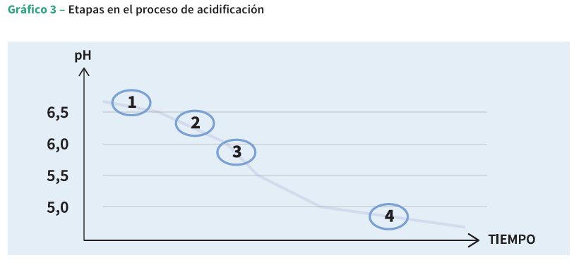 La acidificación del queso se puede dividir en cuatro etapas (Gráfico 3). Los principales aspectos para examinar en la identificación de fallas durante este proceso son la presencia de inhibidores en la leche, levadura fuera de las condiciones de almacenamiento recomendadas y su fraccionamiento inadecuado, que ocurren en la etapa 1.