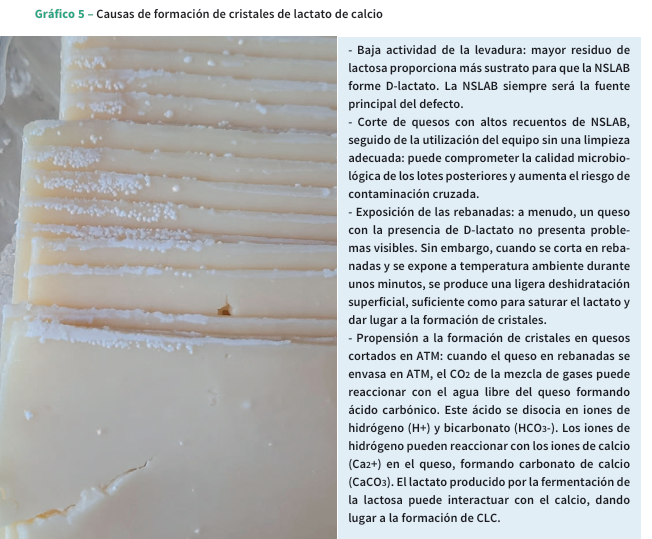 La presencia de cristales de lactato de calcio es un fenómeno que se puede producir en los quesos, especialmente en los cortados en rebanadas y envasados en bandejas de atmósfera modificada (ATM). Estos cristales se forman a partir del lactato, un subproducto de la fermentación de la lactosa por las bacterias lácticas. La formación de CLC puede verse influenciada por diferentes factores, incluyendo el pH del queso, la concentración de calcio y la actividad de las bacterias lácticas. El lactato formado puede presentarse en las formas isoméricas L o D, dependiendo de su conformación química espacial, la cual, a su vez, está determinada por el metabolismo de los microorganismos. El D-lactato de calcio es menos soluble que el L-lactato de calcio. Durante la maduración de los quesos, se produce un aumento del D-lactato. Las NSLAB, como Lactobacilli, Pediococci y Leuconostoc, son capaces de formar más D-lactato y convertir el L-lactato en D-lactato, debido a la presencia de racemasas. Las poblaciones altas de la NSLAB, con índices superiores a 104/g, son suficientes para inducir un aumento significativo de D-lactato, contribuyendo a la formación de CLC. La presencia de CLC en los quesos a menudo es pasada por alto por la industria, principalmente porque las quejas de los consumidores a menudo describen estos cristales como moho blanco (Gráfico 5).