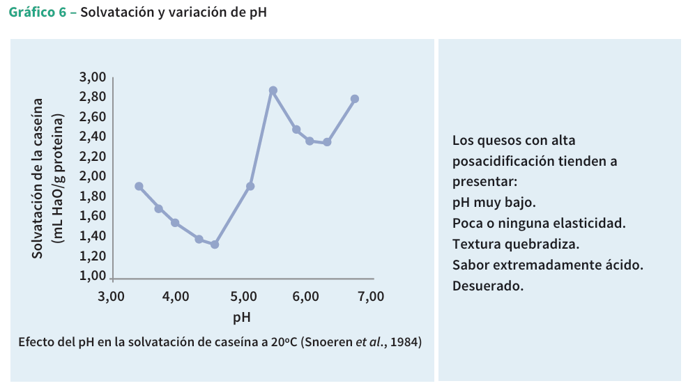Por otro lado, una acidificación excesiva, caracterizada por una caída brusca del pH durante las etapas de fabricación, provoca la disolución excesiva del fosfato de calcio y elimina parte del calcio estructural de las micelas de caseína. Como resultado, la red de proteínas pierde cohesión y se vuelve inestable y menos elástica, lo que también conduce al agrietamiento (Gráfico 2).
