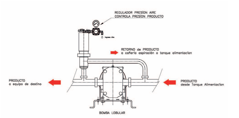 En este tipo de bombas positivas, al limitarse en forma parcial o total la circulación del producto en su impulsión, se produce un aumento de la presión que puede llegar a valores que dañen la misma o los equipos de la instalación. Para evitar ese problema se puede colocar una válvula de alivio o limitadora de la presión como se muestra en el esquema 1. Esta válvula neumática permite su regulación para una apertura total o parcial cuando la presión en la cañería de impulsión de la bomba supera el valor de consigna fijado, abriéndose para retornar el caudal excesivo a la cañería de aspiración o al tanque de alimentación. De esta forma se garantiza que la presión de servicio no supere el valor prefijado.