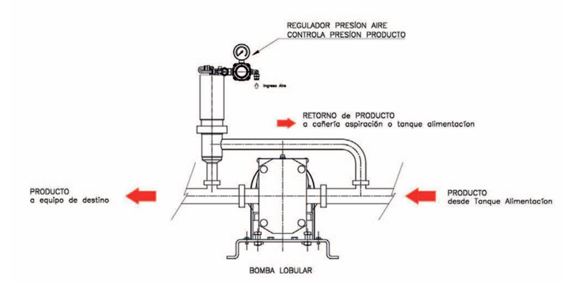 En este tipo de bombas positivas, al limitarse en forma parcial o total la circulación del producto en su impulsión, se produce un aumento de la presión que puede llegar a valores que dañen la misma o los equipos de la instalación. Para evitar ese problema se puede colocar una válvula de alivio o limitadora de la presión como se muestra en el esquema 1. Esta válvula neumática permite su regulación para una apertura total o parcial cuando la presión en la cañería de impulsión de la bomba supera el valor de consigna fijado, abriéndose para retornar el caudal excesivo a la cañería de aspiración o al tanque de alimentación. De esta forma se garantiza que la presión de servicio no supere el valor prefijado.