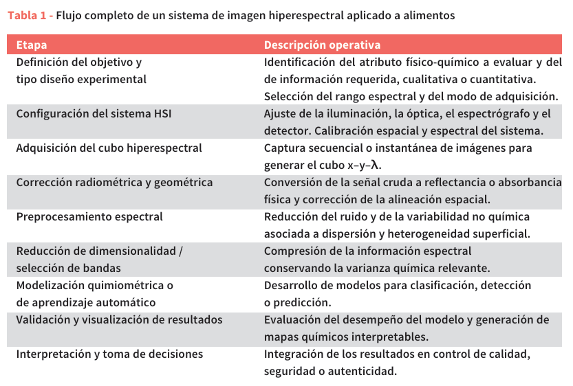 Un sistema HSI se compone de varios elementos integrados que permiten adquirir información espectral y espacial de los alimentos en condiciones controladas (Tabla 1). Su configuración varía según la aplicación específica, pero en general incluye: un sistema óptico (cámara hiperespectral), una fuente de iluminación, una plataforma de muestreo (estática o en movimiento) y una unidad de procesamiento para adquisición, calibración y análisis de datos. La elección adecuada de cada componente es fundamental para garantizar resultados reproducibles y significativos.